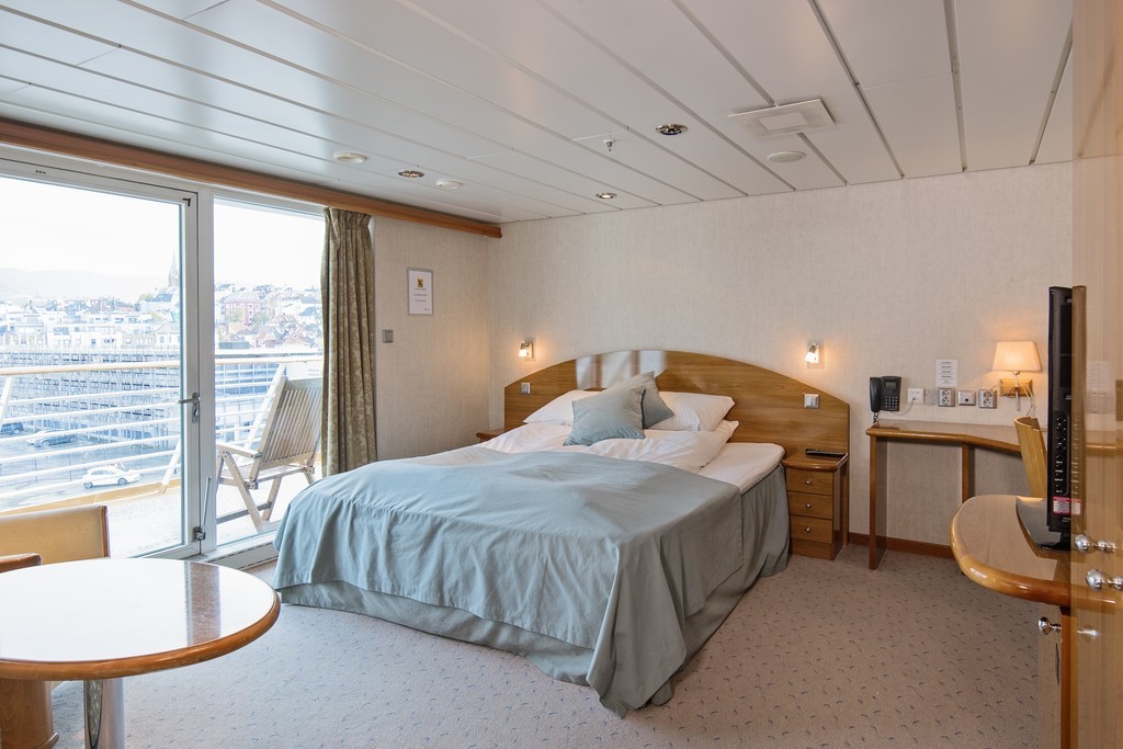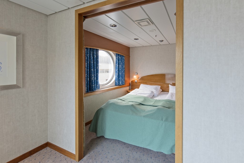 Smaller but by no means less stylish, mini-suites still sport a king-size bed to send you off to sleep after a busy day exploring the Norwegian coast. Most have a sofa to relax on as well. Image for illustration only.