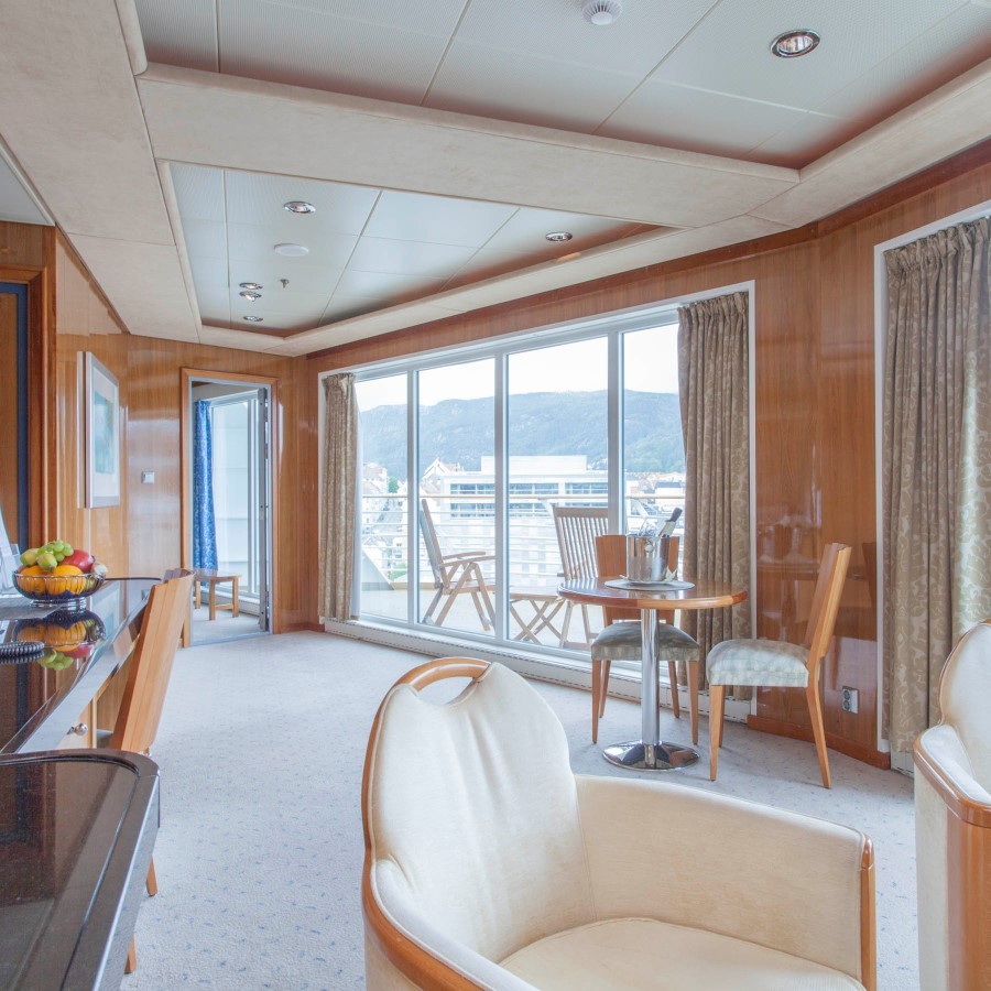 These exclusive suites on the upper decks have two rooms, a seating area, TV, kettle, tea/coffee, stereo, internet access minibar and private balcony. Travel in the best way possible!