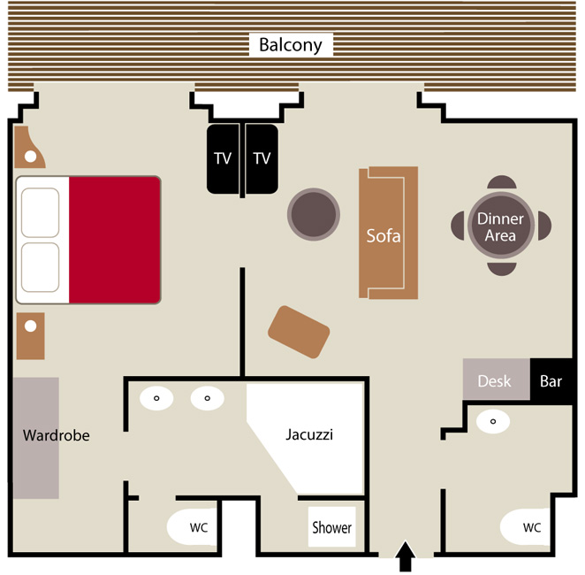 Capacity :up to 2 passengers per cabinSituated on Deck 6Decorated by French designersBreathtakting panoramic sea viewIndividually-controlled air-conditioningKing-size bed or twin bedsBathtub and showerMinibarFlat screenSatellite TVDesk with stationeryIpod™ playersVideo on demandSafeHairdryerBath robesSatellite direct line telephone110/220 volts outletFrench bath products24hr room serviceButler serviceInternet acces wifi1 private transfer (round trip): Airport - Hotel - Port1 free hour of Spa treatments
