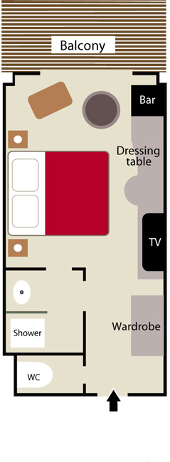 Capacity :up to 2 passengers per cabinPrivate balconyIndividually-controlled air-conditioningKing-size bed or twin bedsShowerMinibarFlat screenSatellite TVDesk with stationeryIpod™ playersVideo on demandSafeHairdryerBath robesSatellite direct line telephone110/220 volts outletFrench bath products24hr room serviceInternet access wifi.